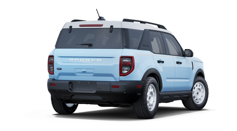 Robins Egg Blue 2025 Ford Bronco Sport Heritage 4WD 8-Speed Automatic 1.5L EcoBoost 4-Wheel Disc Brakes, 6 Speakers, ABS brakes, Air Conditioning, Alloy wheels, AM/FM radio: SiriusXM, AM/FM Stereo, Auto High-beam Headlights, Automatic temperature control, Brake assist, Compass, Convenience Package, Delay-off headlights, Driver door bin, Driver vanity mirror, Dual front impact airbags, Dual front side impact airbags, Electronic Stability Control, Emergency communication system: SYNC 4 911 Assist, Equipment Group 250A, Four wheel independent suspension, Front & Rear Floor Liners w/o Carpet Mats, Front anti-roll bar, Front Bucket Seats, Front Center Armrest, Front Driver/Passenger Seat Back Map Pockets, Front reading lights, Fully automatic headlights, Heated 8-Way Power Driver's Seat, Heated door mirrors, Illuminated entry, Knee airbag, LED Fog Lamps, Low tire pressure warning, Occupant sensing airbag, Outside temperature display, Overhead airbag, Overhead console, Panic alarm, Passenger door bin, Passenger vanity mirror, Plaid Cloth Front Bucket Seats, Power door mirrors, Power steering, Power windows, Premium Wrapped Steering Wheel, Radio data system, Rear anti-roll bar, Rear Parking Sensors, Rear reading lights, Rear seat center armrest, Rear window defroster, Rear window wiper, Remote keyless entry, Security system, SiriusXM, Speed control, Speed-sensing steering, Speed-Sensitive Wipers, Split folding rear seat, Steering wheel mounted audio controls, SYNC 4 w/Enhanced Voice Recognition, Tachometer, Telescoping steering wheel, Tilt steering wheel, Traction control, Trip computer, Universal Garage Door Opener (UGDO), Variably intermittent wipers, Wheels: 17 Oxford White-Painted Aluminum.