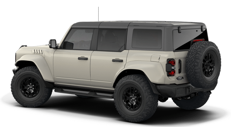 Beige 2026 Ford Bronco Raptor 4WD 10-Speed Automatic 3.0L EcoBoost V6 12 Speakers, 4-Wheel Disc Brakes, ABS brakes, Air Conditioning, Alloy wheels, AM/FM radio: SiriusXM with 360L, Auto High-beam Headlights, Auto-dimming Rear-View mirror, Automatic temperature control, Brake assist, Compass, Connected Navigation, Convertible HardTop, Convertible roof lining, Delay-off headlights, Driver door bin, Driver vanity mirror, Dual front impact airbags, Dual front side impact airbags, Electronic Stability Control, Emergency communication system: 911 Assist, Equipment Group 374A Lux Package, Exterior Parking Camera Rear, Ford Connectivity Package (1-Year Included), Front anti-roll bar, Front Bucket Seats, Front Center Armrest, Front dual zone A/C, Front fog lights, Front reading lights, Front wheel independent suspension, Fully automatic headlights, Glass rear window, Hard Top Sound Deadening Headliner, Heated door mirrors, Heated front seats, Heated steering wheel, Illuminated entry, Integrated roll-over protection, Leather Shift Knob, Leather-Trimmed/Vinyl Bucket Seats, Low tire pressure warning, Marine Grade Vinyl Bucket Seats, Navigation system: Connected Navigation, Occupant sensing airbag, Outside temperature display, Overhead airbag, Overhead console, Panic alarm, Passenger door bin, Passenger vanity mirror, Power door mirrors, Power steering, Power windows, Radio data system, Rear anti-roll bar, Rear seat center armrest, Rear window defroster, Rear window wiper, Rear-Window Defroster and Washer, Remote keyless entry, Security system, Shadow Black Painted Hard Top, SiriusXM with 360L, Speed control, Split folding rear seat, Steering wheel mounted audio controls, SYNC 4, Tachometer, Telescoping steering wheel, Tilt steering wheel, Traction control, Trip computer, Turn signal indicator mirrors, Variably intermittent wipers, Voltmeter, Wheels: 17 Black High Gloss-Painted Aluminum.